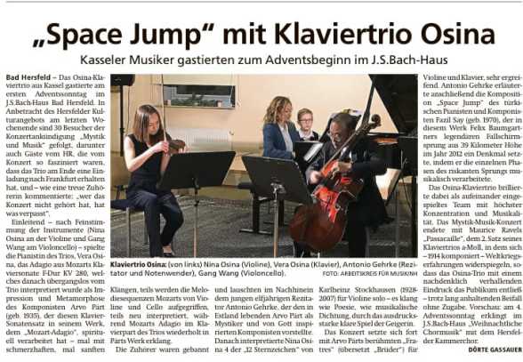 Leichtfüßig kam das bei Jakubczyk rüber. Ein unterhaltsames Spiel mit Worten, die doch viel zu sagen haben. Ihm zur Seite: die exzellenten Musikerinnen Nina Osina (Violine) und Ji-Youn Song (Klavier) – sehr konzerterfahren und, wie der Abend zeigte, offen für eine Musik, die nicht auf verträumte Kompositionen setzt, sondern auf Lautmalereien, auf experimentelle Klänge und Minimal Music. Bei einem Werk der Russin Sofia Gubaidulina („Der Seiltänzer“), das neben Kompositionen von Tom Johnson und György Kurtag auf dem Programm stand, kam das zum Tragen, viel mehr aber noch bei Alfred Schnittkes „ Sonata No.2 – Quasi una Sonata“ (1968).
